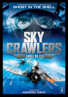 Chaque nouveau film du maître Oshii constitue un évènement. Après l’OVNI « Tachiguishi Retsuden » sur la restauration rapide, réalisé à partir d’animations de photos, le réalisateur de « Ghost in the shell » revient au monde du dessin animé qui l’a fait roi. « Sky Crawlers » est ainsi son premier film d’animation traditionnel depuis son chef-d’oeuvre « Innocence » (2004), et on retrouve bel et bien l’univers particulier du réalisateur, champion incontesté de l’auto-citation : l’incontournable basset, les plans contemplatifs où ses personnages observent le ciel, les plages douces de la bande-son de Kenji Kawai, sa fascination pour les armes et les avions de guerre, ses références visuelles rétro, ses infographies aux tons ocres… Le bonhomme va même jusqu’à nommer certains personnages en référence à d’autres de ses films : la brune et attirante Kusanagi (« Ghost in the shell »), le fantôme Jinroh (« Jin Roh, la brigade des loups » qu’il a produit et supervisé).