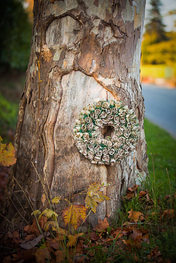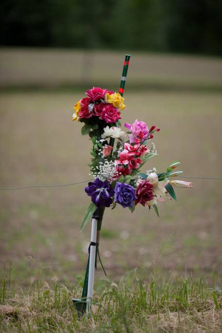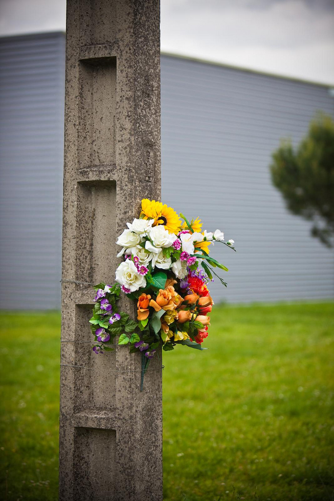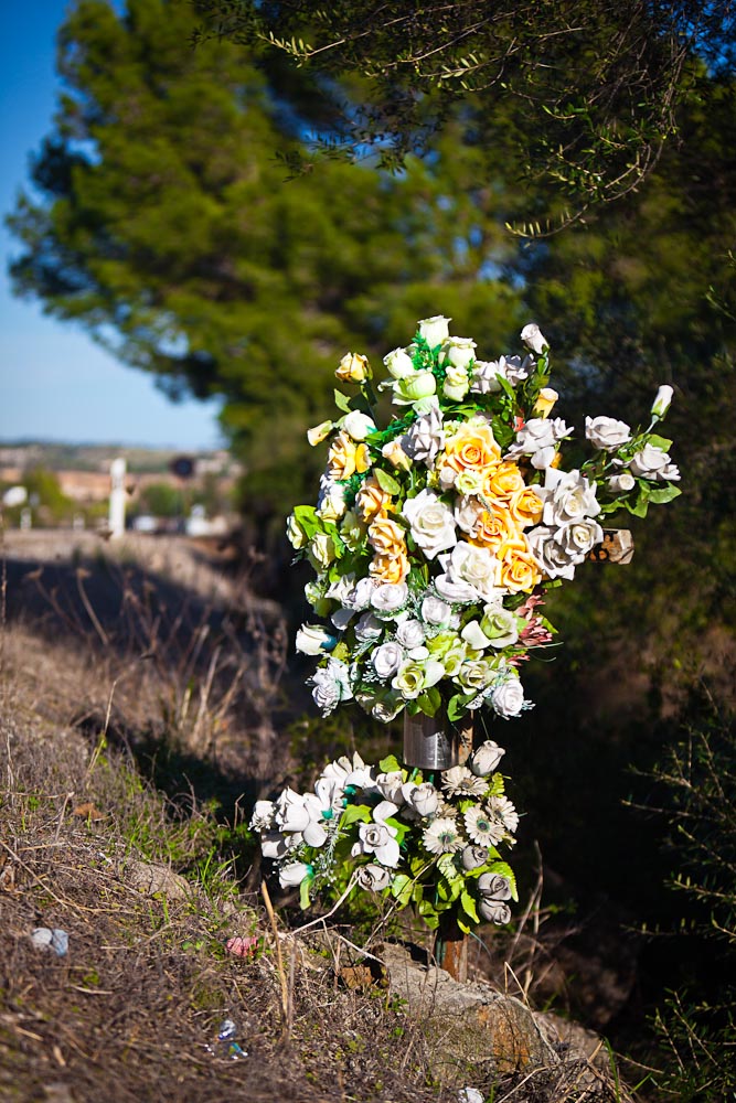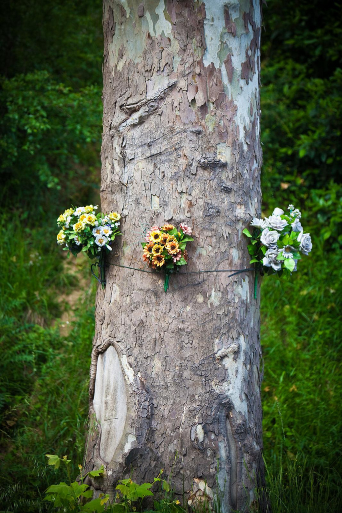 Fleurs fraîches, sèches ou plastiques accrochées à un platane, un poteau, une borne, un pont…