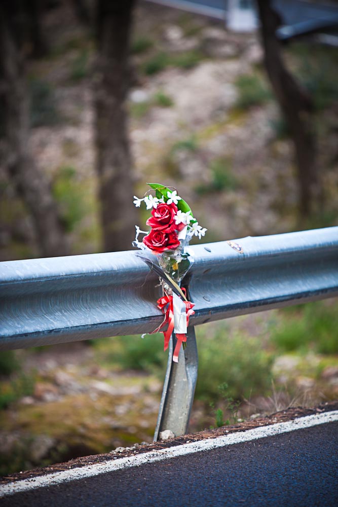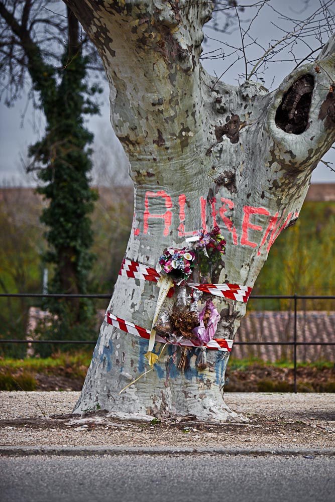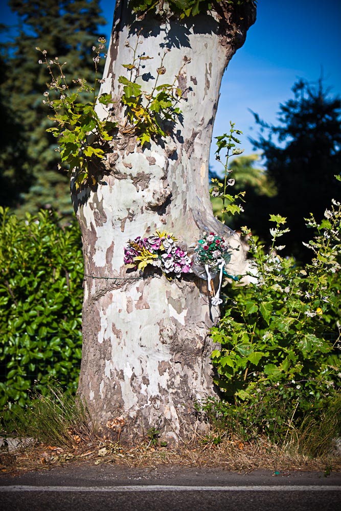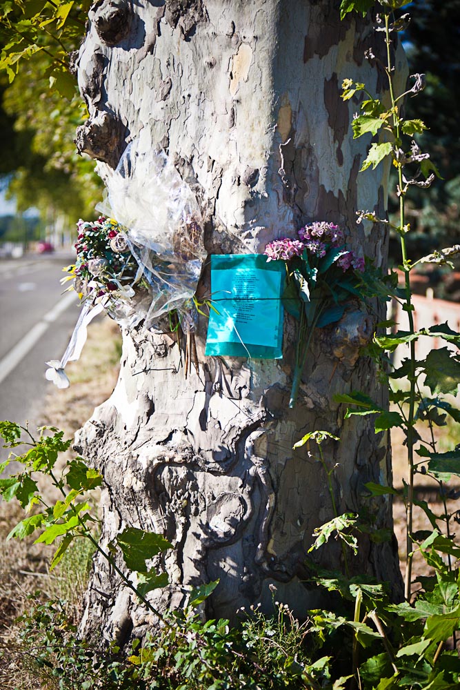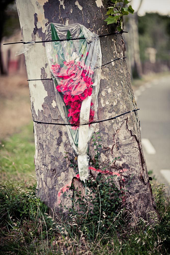A pied, à vélo, à moto, en voiture, sur le bord de route parfois des éraflures, sinon, une tache de couleur, un bouquet, une croix, une plaque, un ou des noms ou prénoms, une date, un chagrin, une perte, une mémoire.