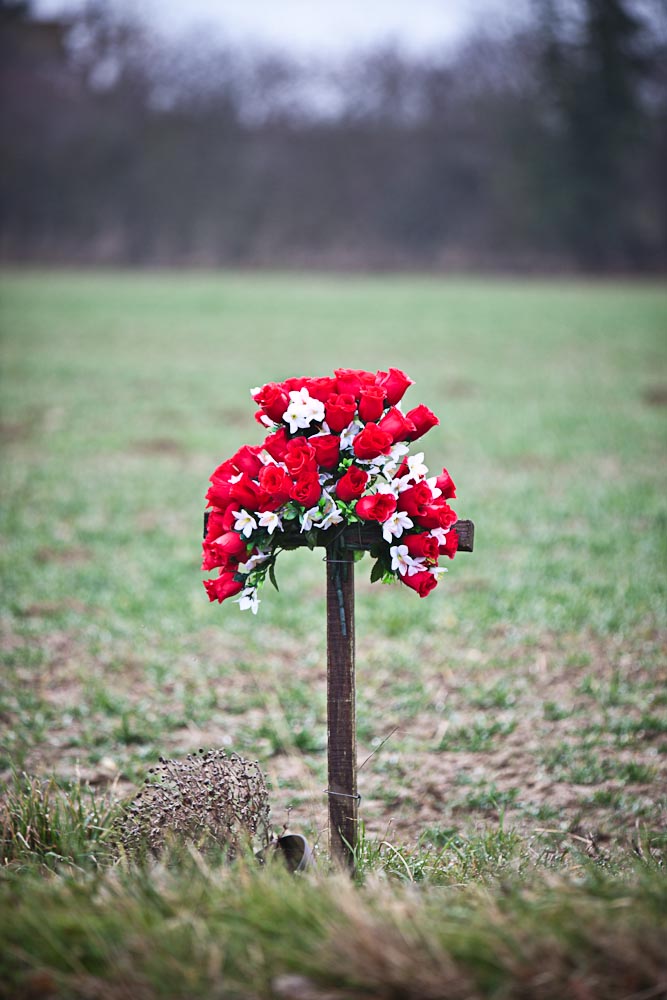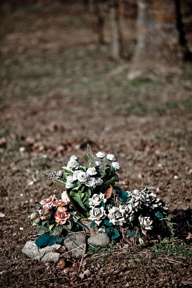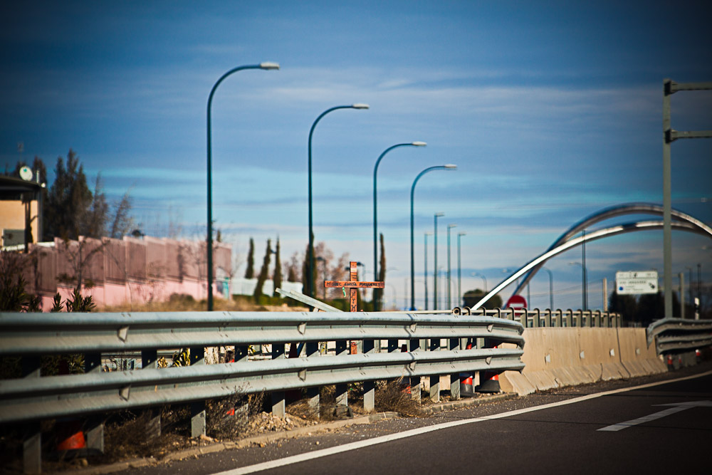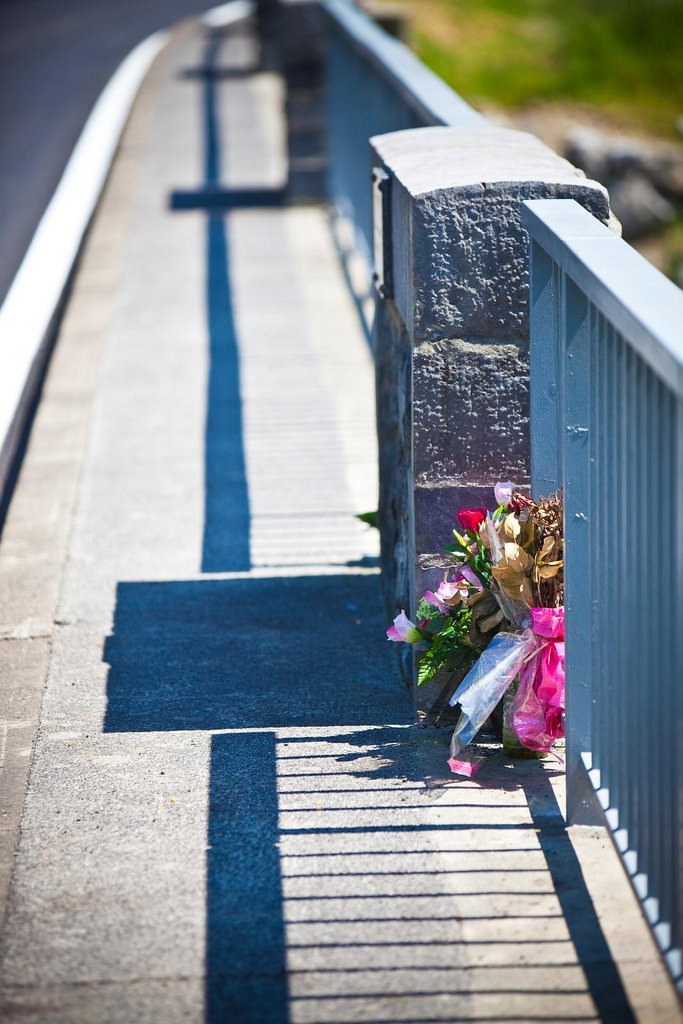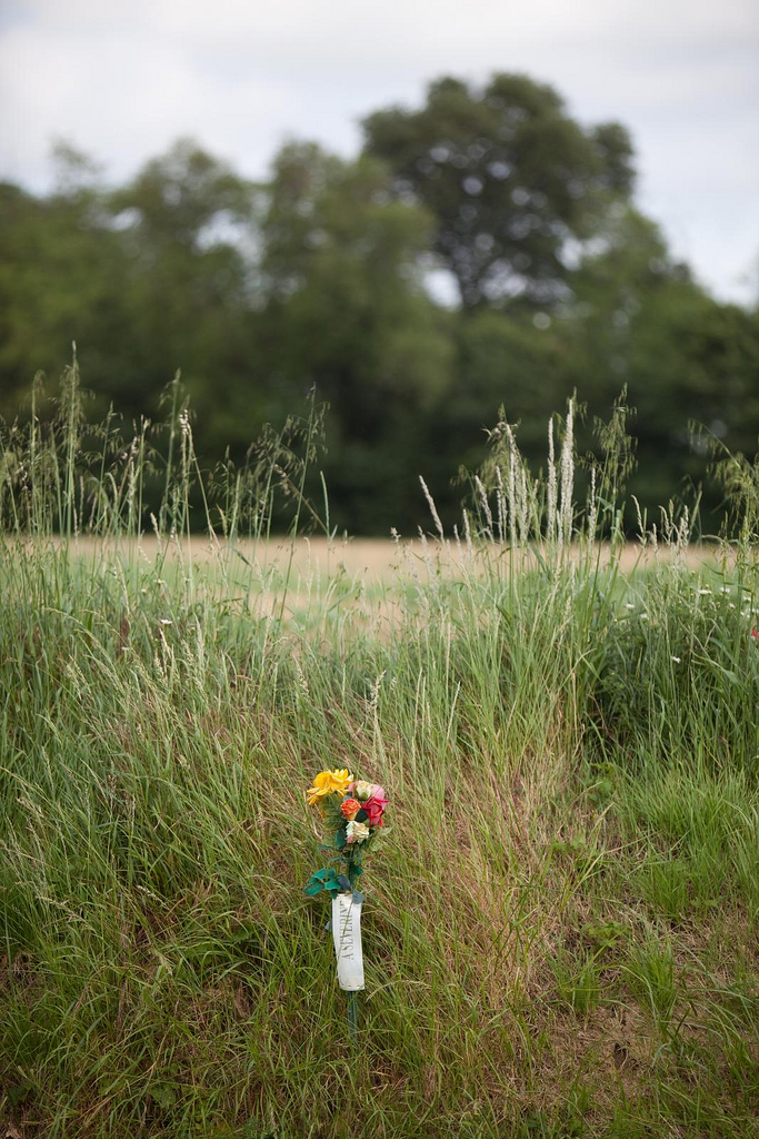 A pied, à vélo, à moto, en voiture, sur le bord de route parfois des éraflures, sinon, une tache de couleur, un bouquet, une croix, une plaque, un ou des noms ou prénoms, une date, un chagrin, une perte, une mémoire.