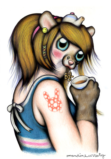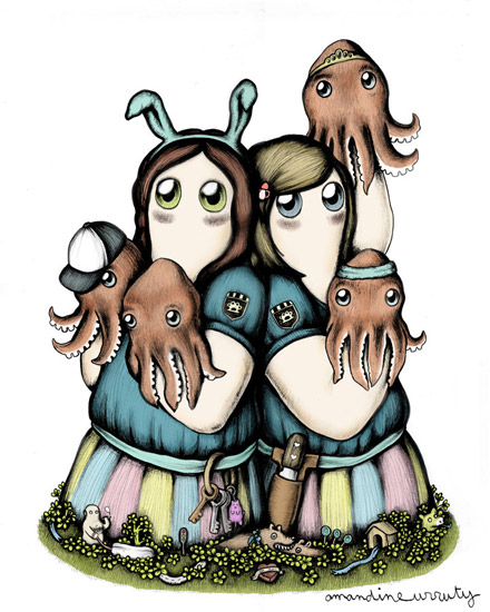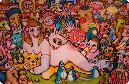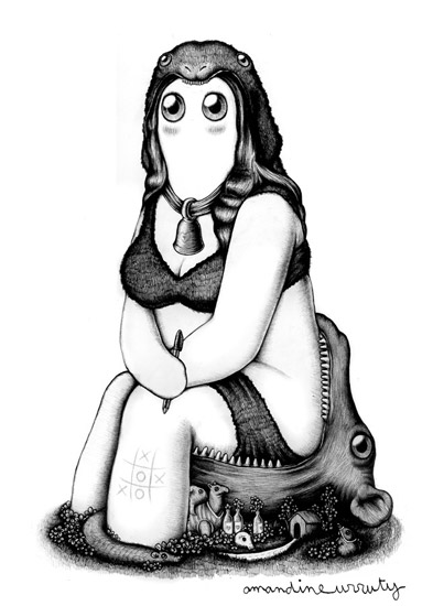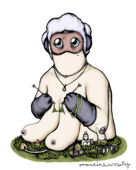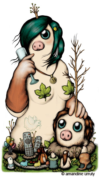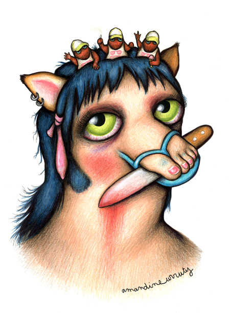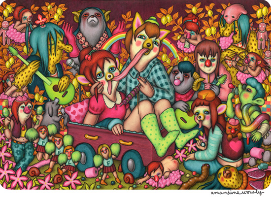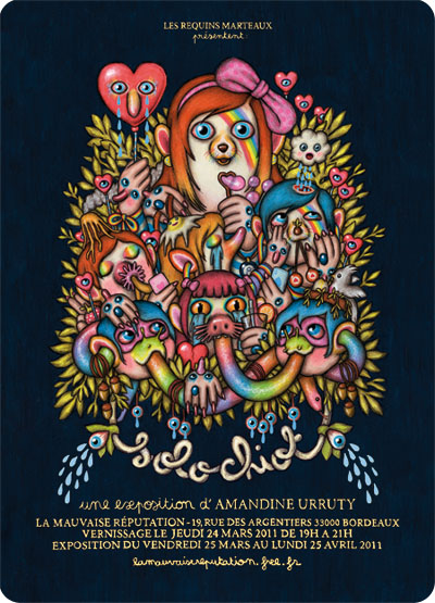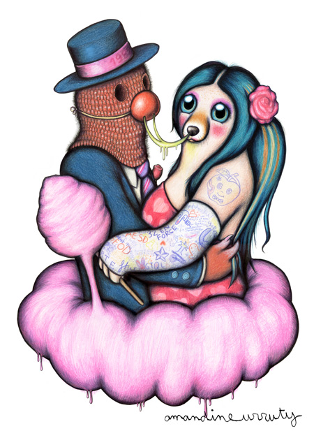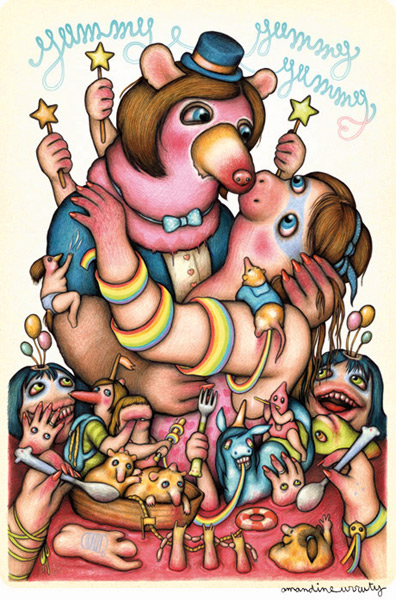 Dans L’URRUTY, tout est bon 😉 , elle manie la chair avec drôlerie, c’est à consommer sans modération ! Des yeux, des poils des orifices, des appendices et des gourmandises dans les tons de ces dernières sont un peu sa marque de fabrique pour ses réalisations au crayon de couleur ou plus récemment à la peinture.