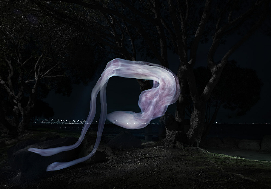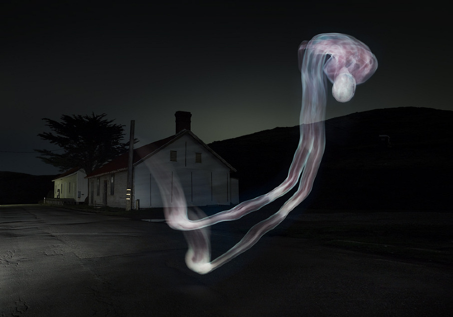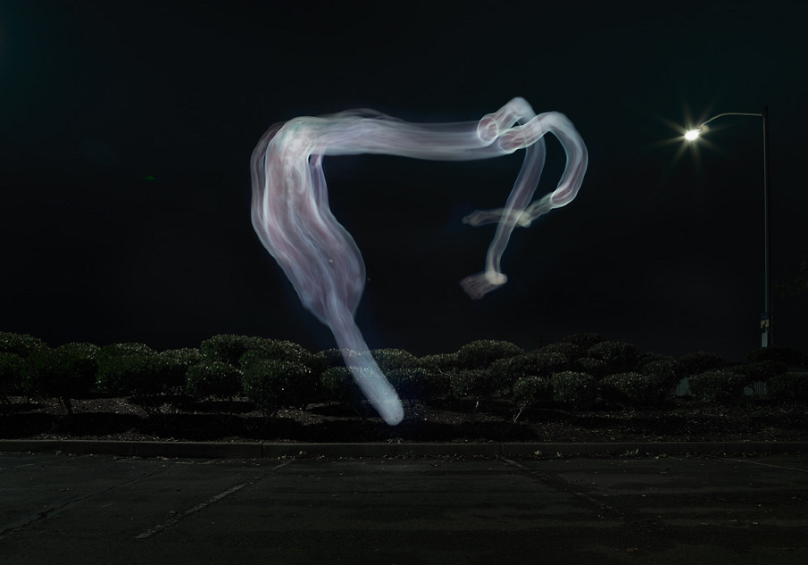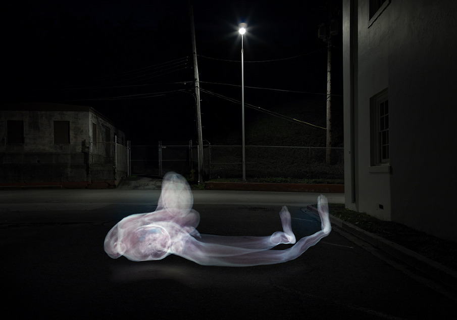 De l’autre l’intérieur d’un corps mort de nuit dans un cadre plus urbain, en light-painting via l’écran d’un ordinateur, procédé numérique en 2011