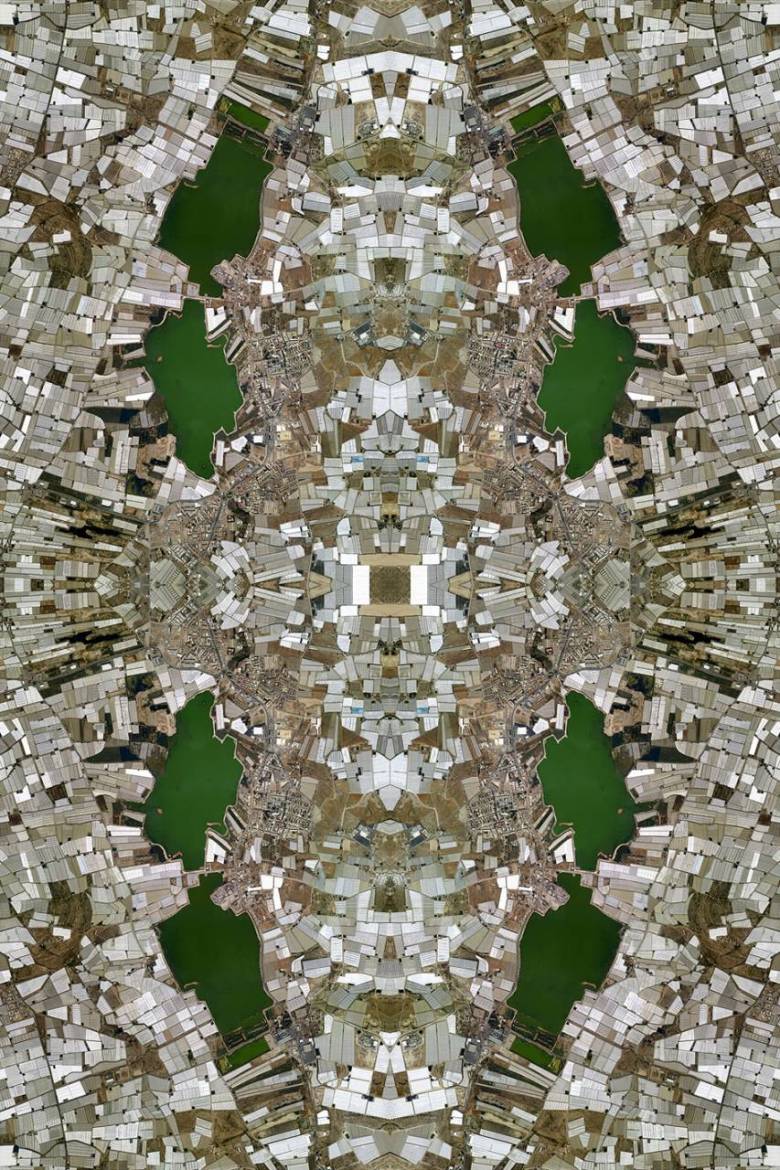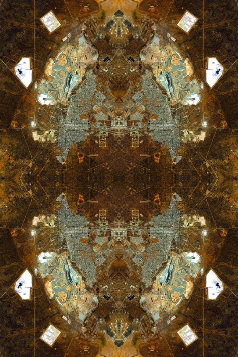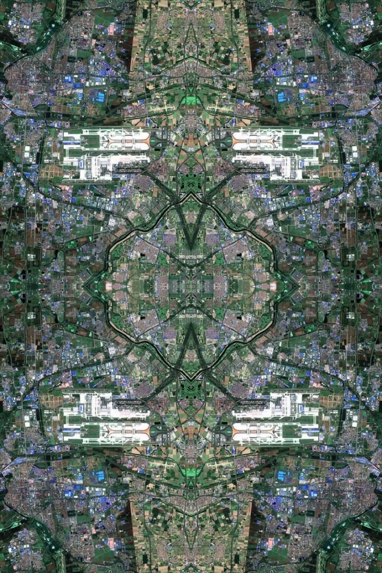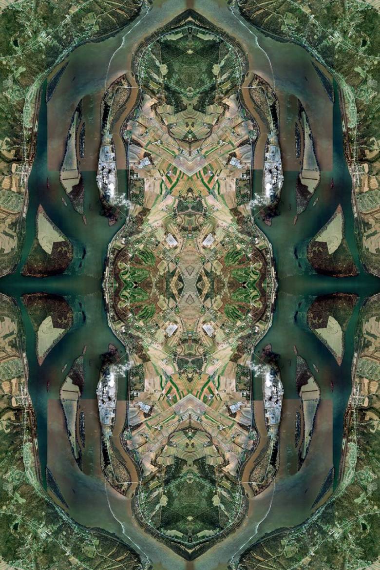 L’Irlandais David Thomas SMITH réalise des montages kaleidoscopiques à partir d’images satellites provenant du net. Son travail s’appuie sur les modèles et les motifs utilisés pour les tapis persan, en particulier la façon dont les tisserands afghans utilisaient le tapis pour enregistrer leurs expériences comme la terre déchirée par la guerre qui les entourait.