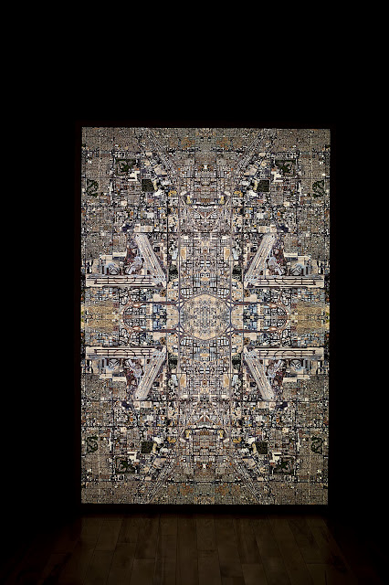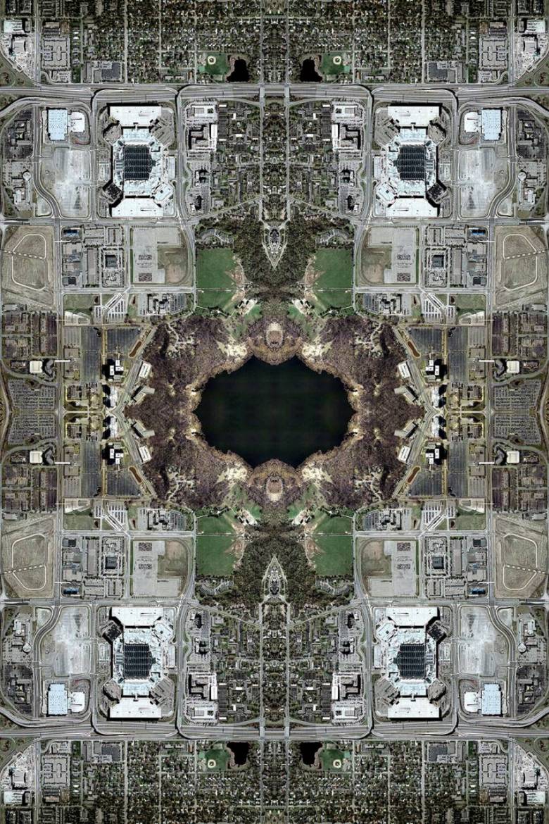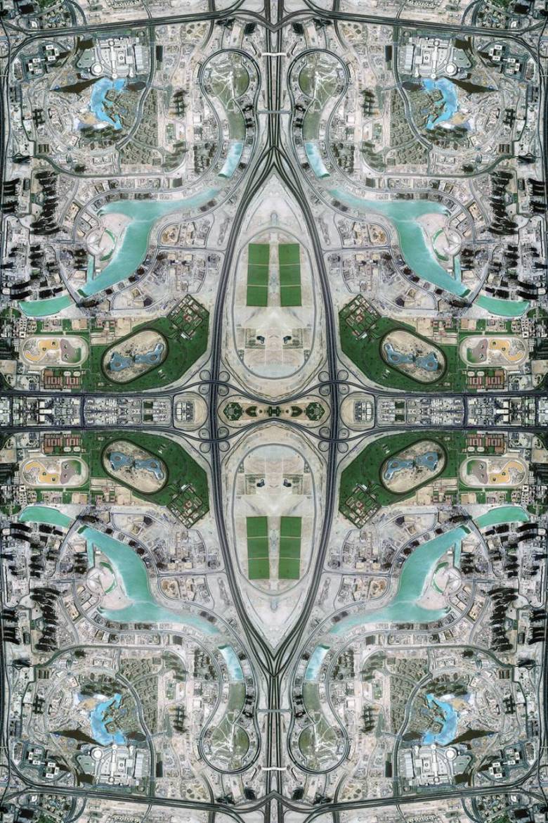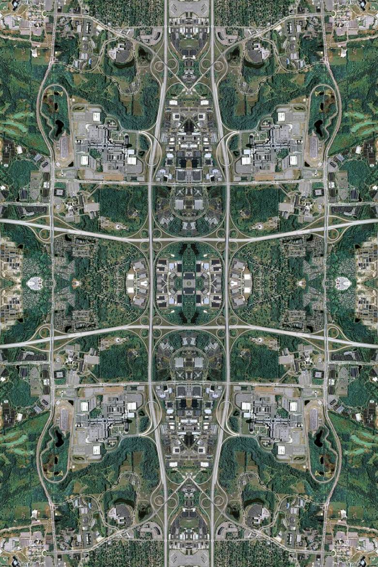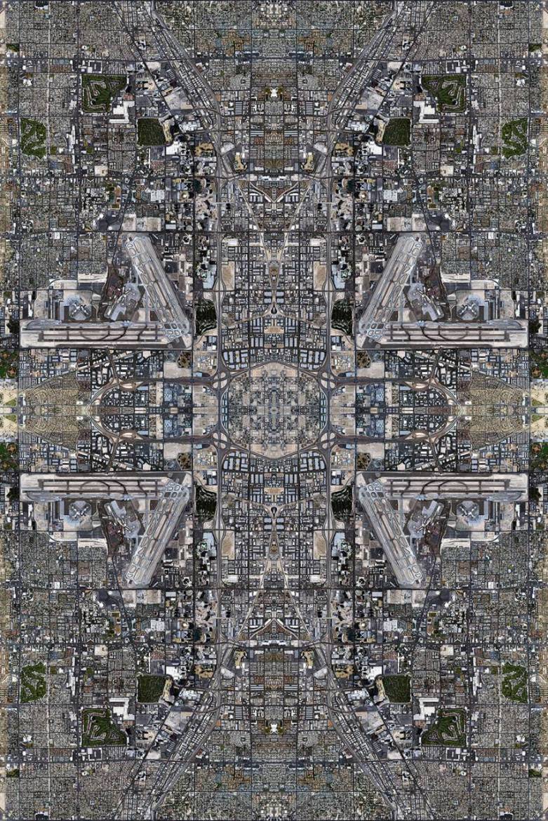 L’Irlandais David Thomas SMITH réalise des montages kaleidoscopiques à partir d’images satellites provenant du net. Son travail s’appuie sur les modèles et les motifs utilisés pour les tapis persan, en particulier la façon dont les tisserands afghans utilisaient le tapis pour enregistrer leurs expériences comme la terre déchirée par la guerre qui les entourait.