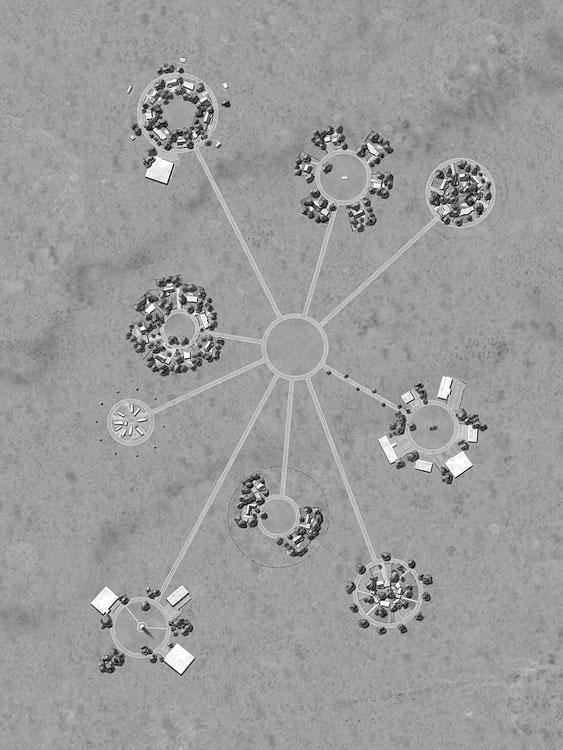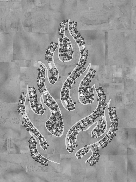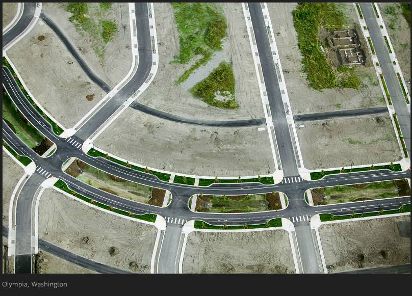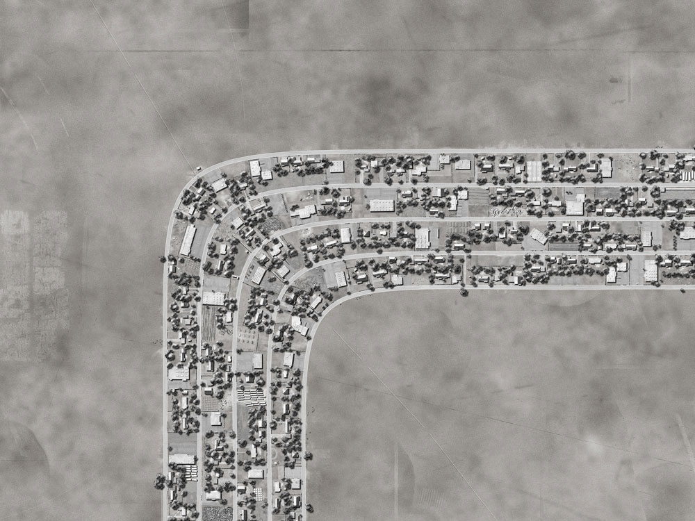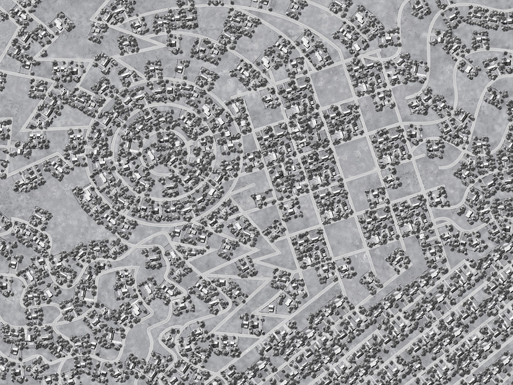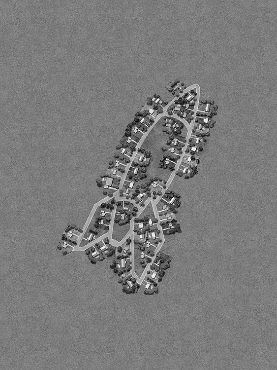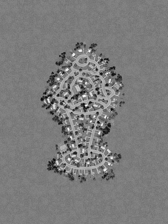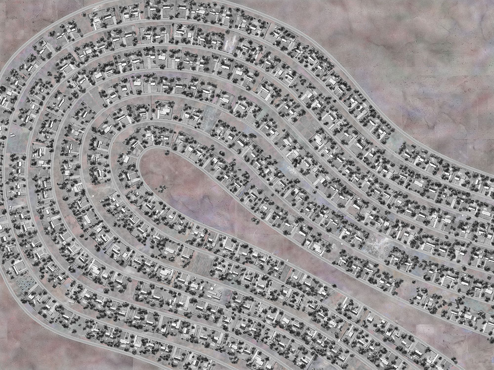 Ross RACINE dessine sur ordinateur des vues aériennes de banlieues fictives qu’il imagine et nomme SUBDIVISIONS.
