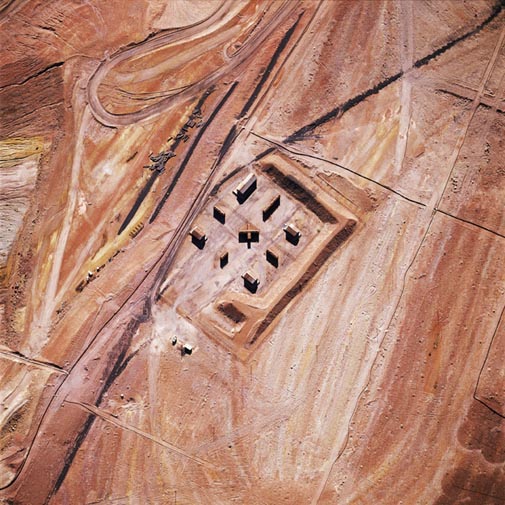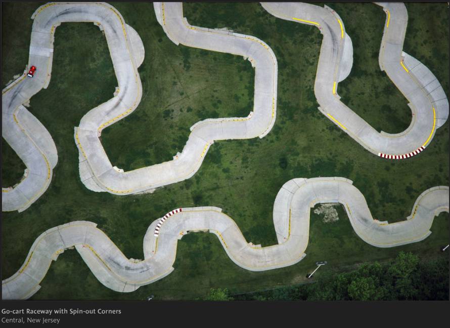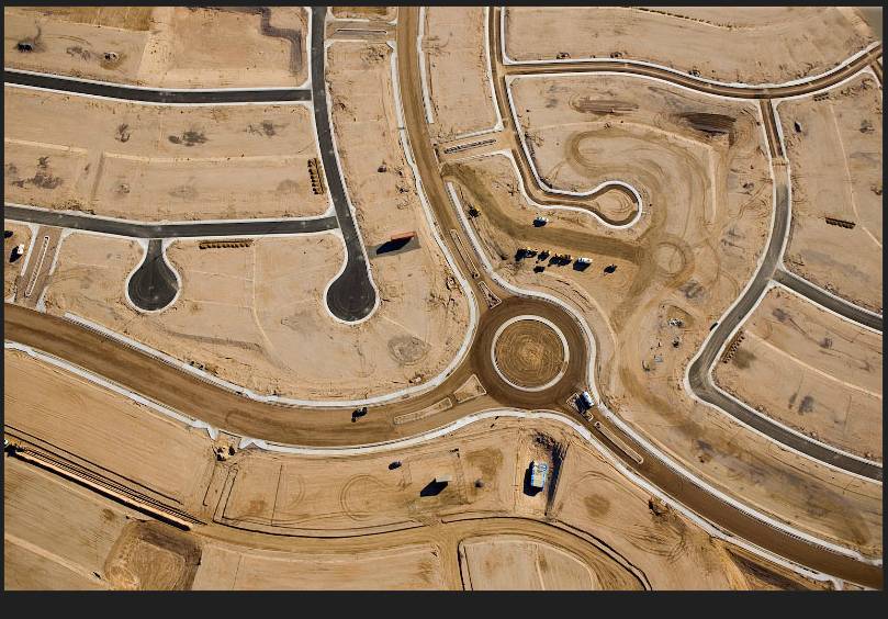 Andreas GURSKI à photographié le circuit de course de Bahreïn. Il a réassemblé les images d’asphalte dans une composition abstraite. Un exemple encore de photo aérienne réinterprétée (pour comparaison une vue satellite du circuit de Bahreïn suit en dessous).