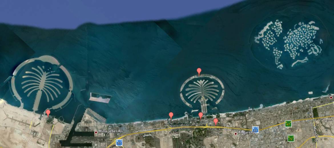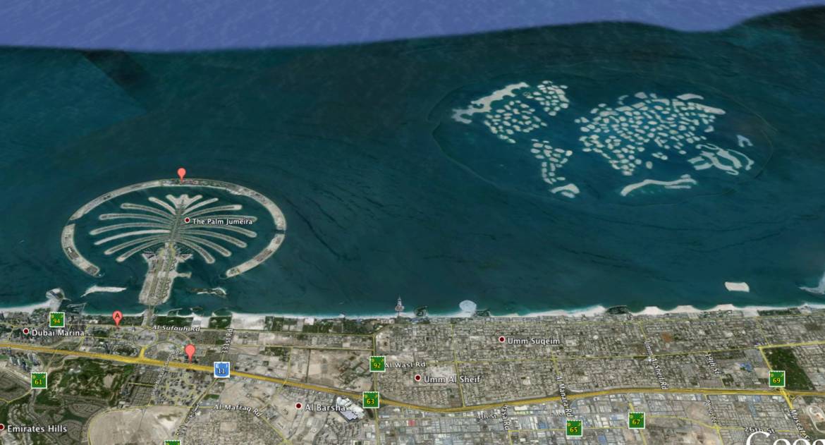 En haut à droite de la première image des Iles Palmiers, on eut voir des ilots artificiels qui forment une planisphère.