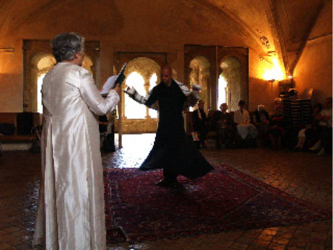 Avant de les psalmodier, Dame Manijeh nous offre en français la substantifique moelle des ghazals (poèmes) de Jalâl ud-Dîn Rûmî : la musique de ces poésies, rythmée et cadencée par la danse, le souffle et le chant du roseau occitan, forment le spectacle vivant présenté aujourd’hui.