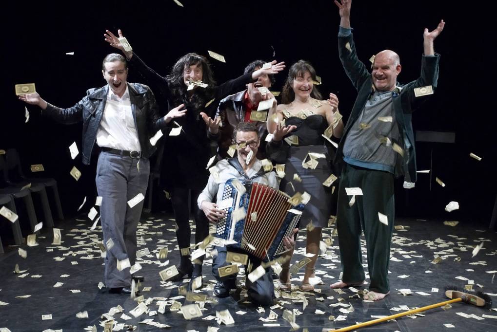 Au centre de ce ballet finement chorégraphié, Jean Stéphane est un Harpagon avare d’effets trop faciles. Il est le héros pathétique d’un bal où tout le monde avance masqué. Dans un dispositif quadri-frontal, les spectateurs installés autour de la scène assistent au combat peu moral d’un homme contre les siens. Six comédiens, donc, s’attèlent à cette relecture aussi riche d’idées que son économie est modeste, entre comédie musicale contenue et théâtre classique version queer.