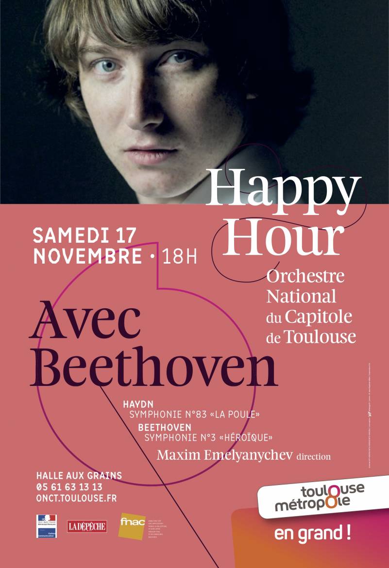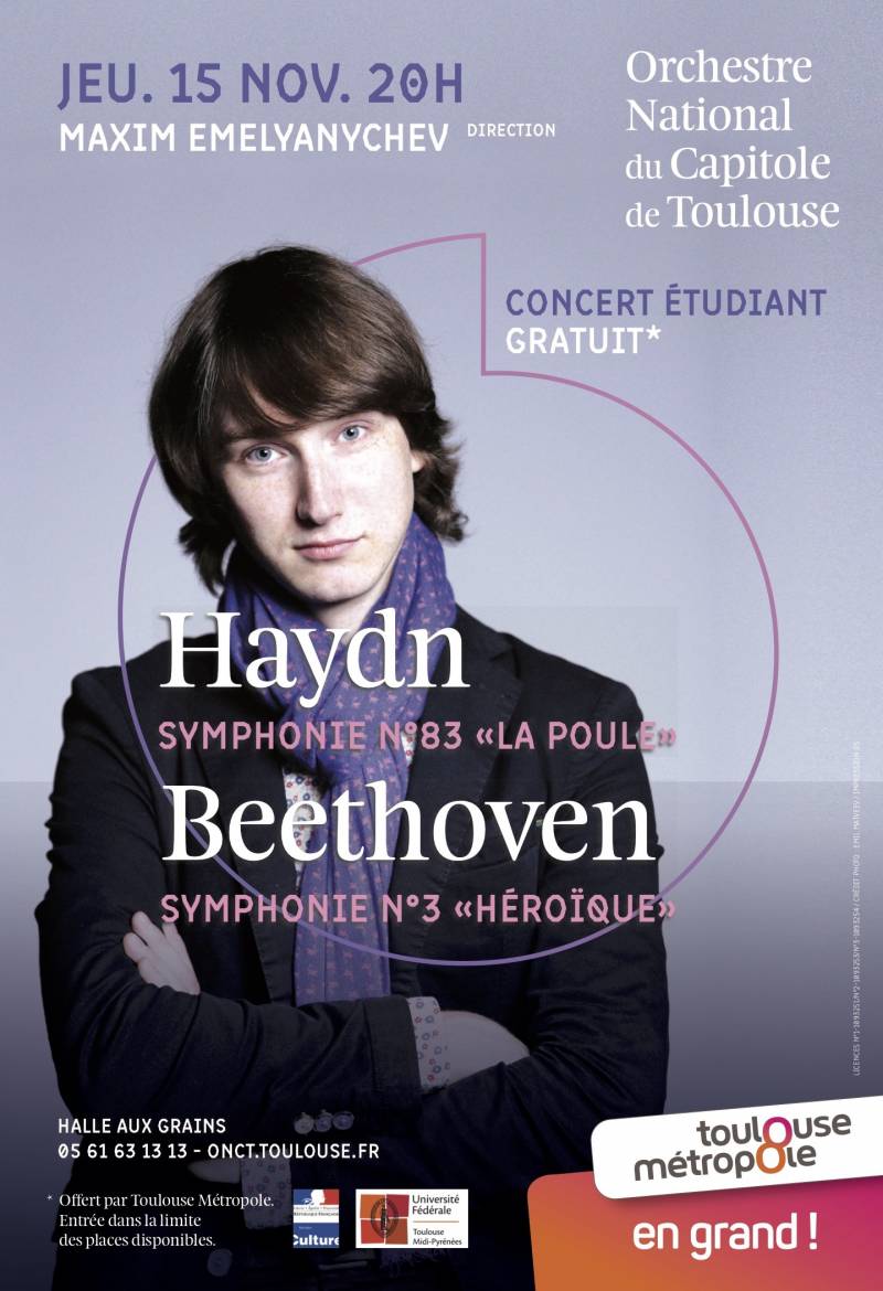 Pour son retour à Toulouse dans le cadre du concert offert aux étudiants le 15 novembre et des événements « Happy Hour », le 17 novembre, il choisit de réunir deux symphonies à la frontière du classicisme et du romantisme. La Symphonie n° 83, de Haydn, surnommée « La Poule », précèdera l’une des plus célèbres partitions de Beethoven, sa Symphonie n° 3 dite « Héroïque » initialement dédiée à Bonaparte. On sait que Beethoven déchirera cette dédicace lorsqu’il apprendra que celui qu’il prenait pour l’héritier des principes généreux de la Révolution se fera couronner empereur. La Symphonie n° 3 sera lors dédiée tout simplement « A la mémoire d’un grand homme » et portera le sous-titre Eroïca. Maxim Emelyanychev, musicien surdoué, ne manquera pas de souligner le caractère révolutionnaire de l’œuvre considérée comme un élément déterminant de l’Histoire de la musique classique. Elle apparaît comme la marque du début de la période romantique.