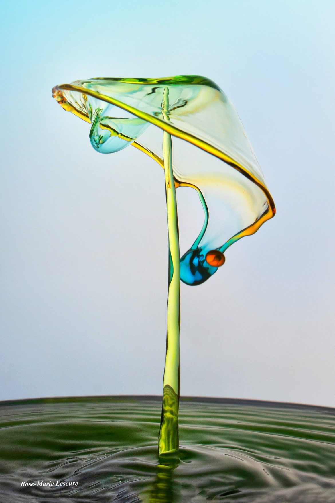 R.M Lescure : Au départ, nous avons téléchargé une carte numérique Arduino. Ensuite un logiciel qui a été conçu par un photographe allemand qui a mis sa création à disposition du public. Mon mari l’a téléchargé et depuis, nous utilisions ce dispositif qui commande tout le système. Cela permet de piloter la séquence complète du dispositif de prise de vue, c’est-à-dire les ouvertures et fermetures des électrovannes, la pose bulb du réflex, le déclenchement du flash. Lorsque les gouttes d’eau vont se rencontrer, à ce moment le flash se déclenche et saisi la collision. L’impact d’une goutte d’eau à la surface d’un liquide produit dans un premier temps une couronne et une poche d’air en son centre. Ensuite, la couronne se referme partiellement sur elle-même et il apparaît une colonne d’eau ascendante. Une 2e goutte retardée percute le sommet de la colonne afin de produire une figure surprenante. La brièveté du phénomène est figée grâce à l’éclair du flash, afin de saisir « ce que l’œil ne voit pas ».
