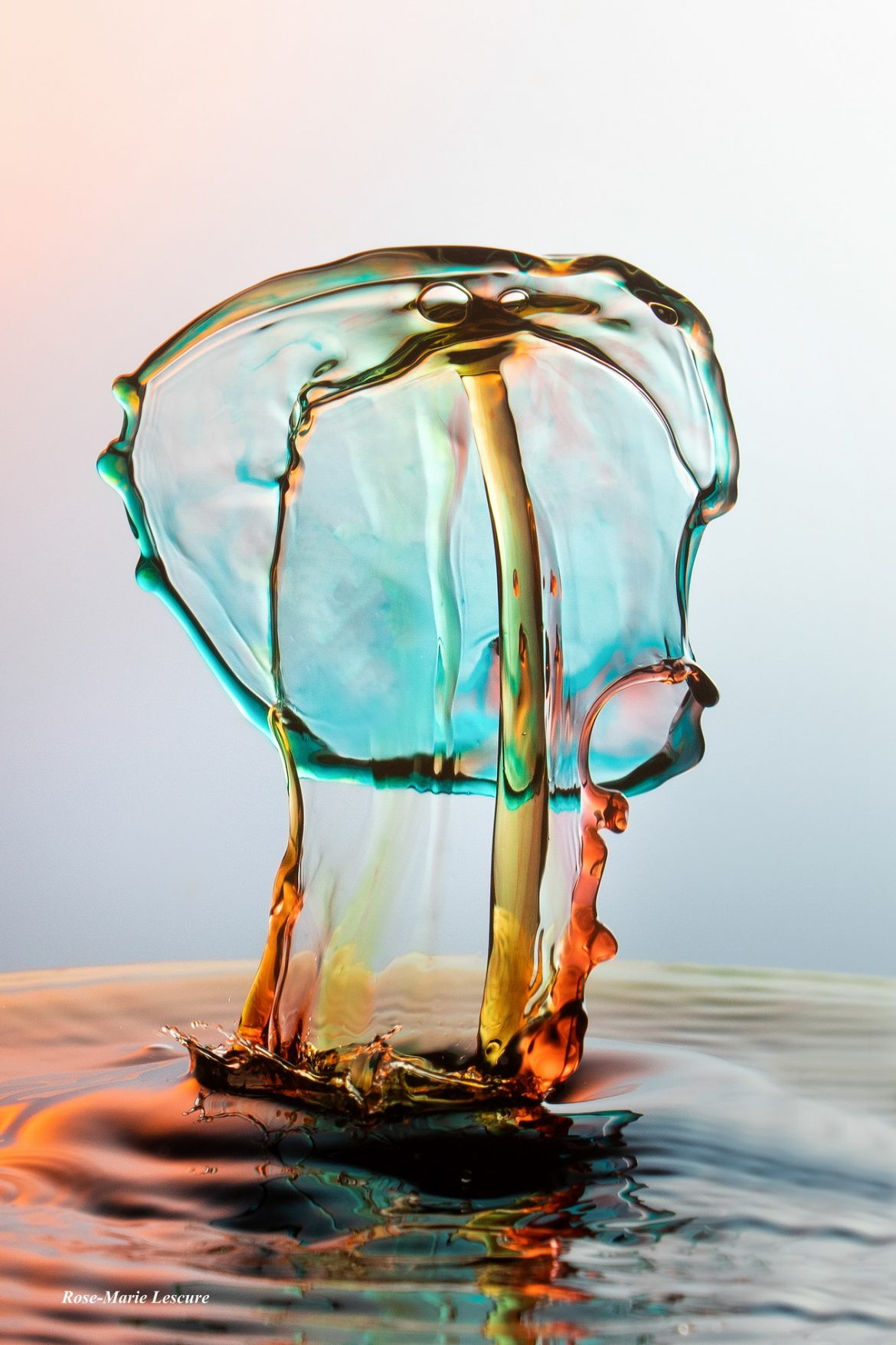 R.M Lescure : Ce qui est le plus complexe, ce sont les trajectoires. Il faut que les trois électrogènes convergent vers le même point et qu’elles se touchent. Nous avons beau aligner correctement parfois cela marche et des fois la goutte peut partir à côté. Donc, on peut avoir de belles collisions comme de belles déceptions. Lorsque j’ai débuté cette discipline, il y a quatre ans, je pouvais déclencher 500 fois et obtenir un ou deux clichés intéressants. Avec le temps, la patience et un bon technicien à mes côtés (mon mari !) j’ai amélioré le « rendement ». Aujourd’hui, pour 500 prises de vues, je peux obtenir jusqu’à 15 ou 20 photos sympas.